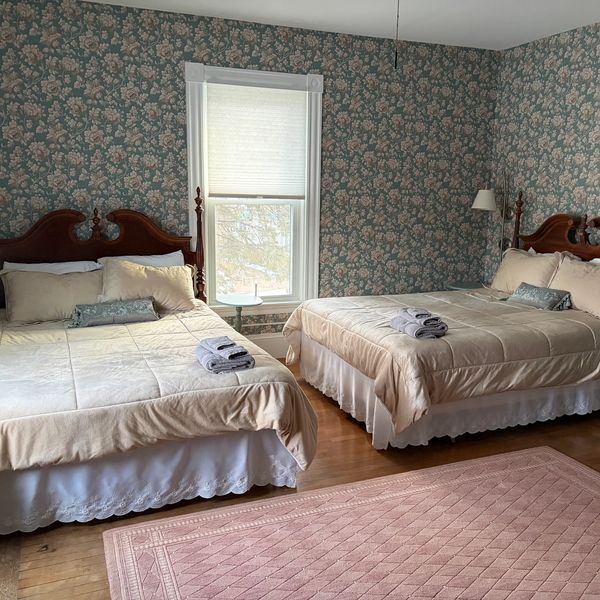 This room, honoring the Hudson family, features two queen beds and offers breathtaking views of the Piscataquis River.